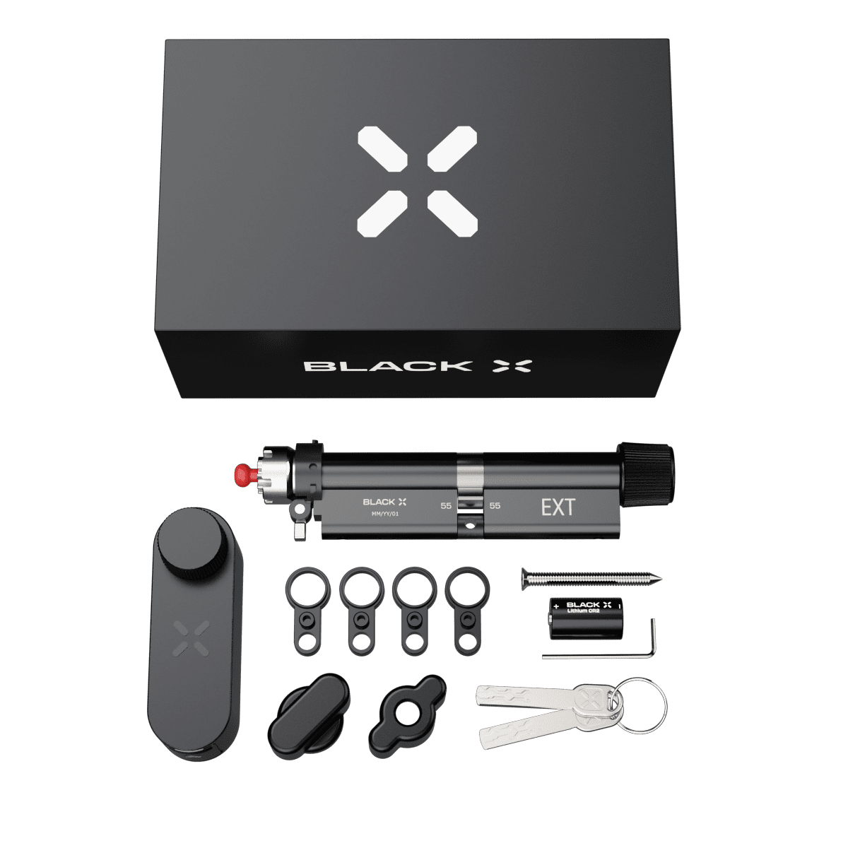 Developed as a modular alternative to standard Euro profile cylinders, this smart lock adjusts to multiple door size ranges for a precise fit. Operated using the BLACK X App on iOS or Android, it allows controlled digital access and compatibility with supported BLACK X accessories.