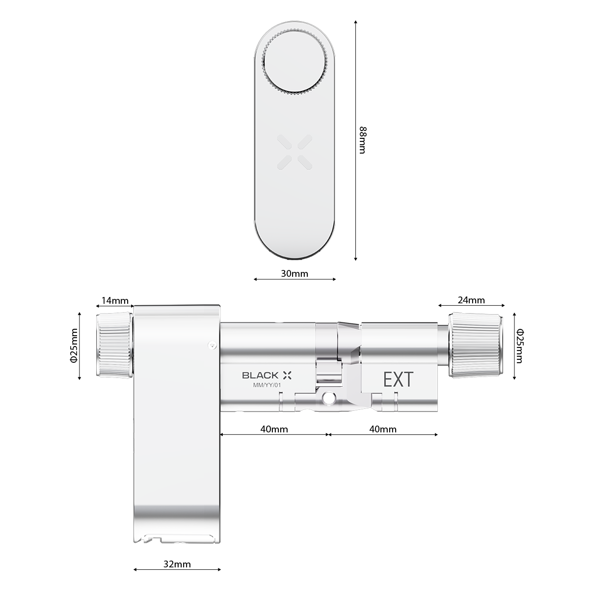 Developed  as a modular alternative to standard Euro profile cylinders, this smart lock  adjusts to multiple door size ranges for a precise fit. Operated using the  BLACK X App on iOS or Android, it allows controlled digital access and  compatibility with supported BLACK X accessories.