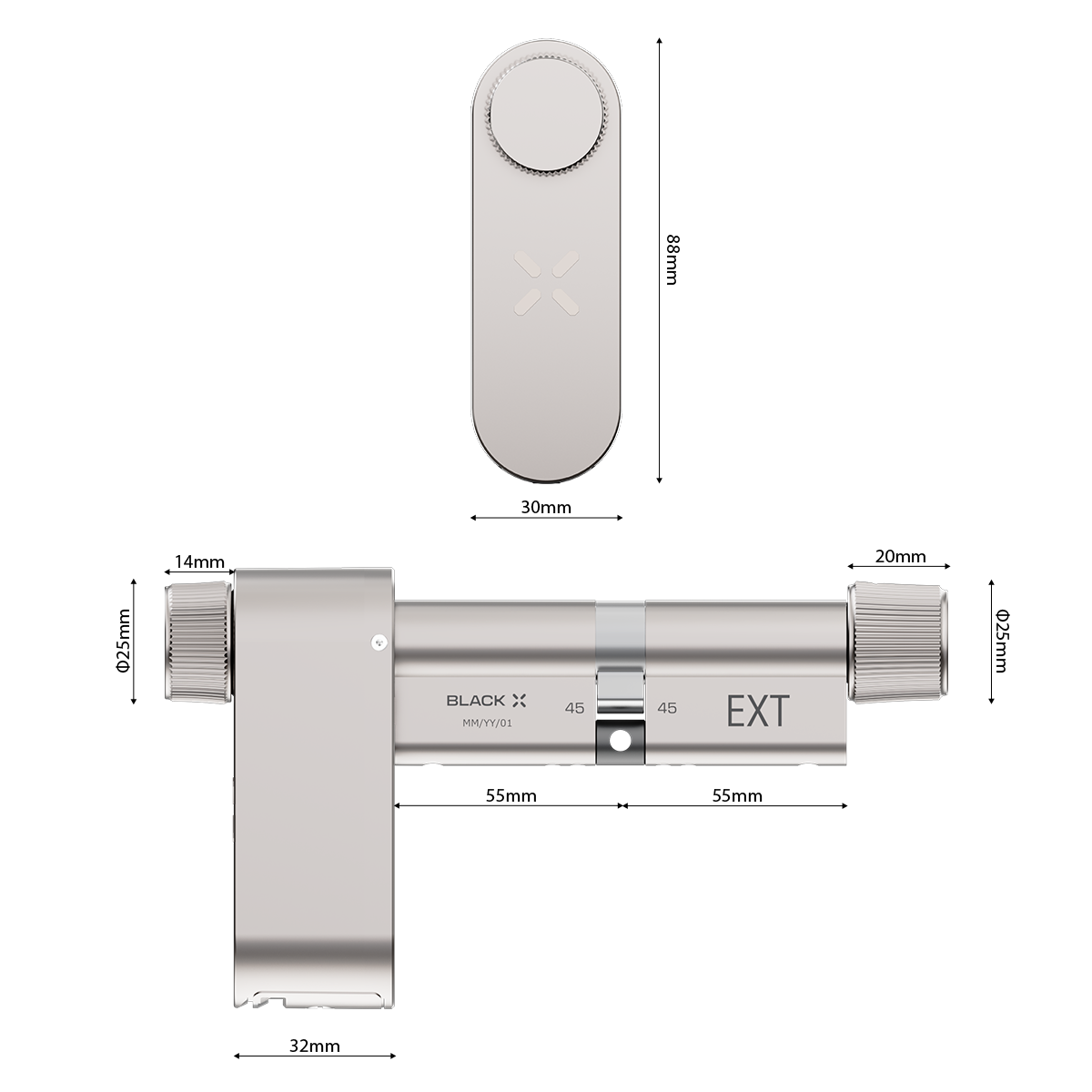 Developed as a modular alternative to standard Euro profile cylinders, this smart lock adjusts to multiple door size ranges for a precise fit. Operated using the BLACK X App on iOS or Android, it allows controlled digital access and compatibility with supported BLACK X accessories.